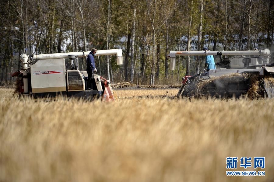 10月18日,河北省承德市滦平县金沟屯镇金沟屯村农民在收割有机水稻。 金秋时节,多地水稻飘香。农民在田间忙碌,确保粮食颗粒归仓。 新华社发(王立群 摄)