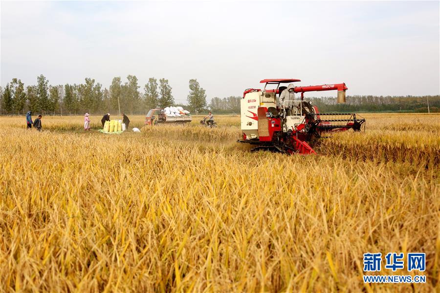10月17日,山东省枣庄市台儿庄区农民驾驶收割机在田间收割水稻。 金秋时节,多地水稻飘香。农民在田间忙碌,确保粮食颗粒归仓。 新华社发(孙中喆 摄)