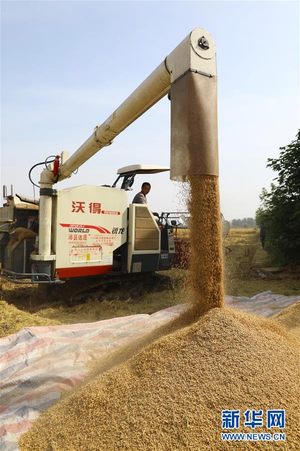 10月18日,安徽省淮北市杜集区朔里镇的农民在收获稻谷。 金秋时节,多地水稻飘香。农民在田间忙碌,确保粮食颗粒归仓。 新华社发(万善朝 摄)