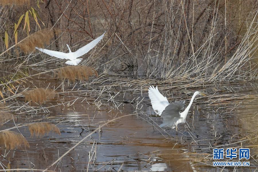 10月18日,两只白鹭在新疆玛纳斯国家湿地公园觅食。新华社记者 丁磊 摄