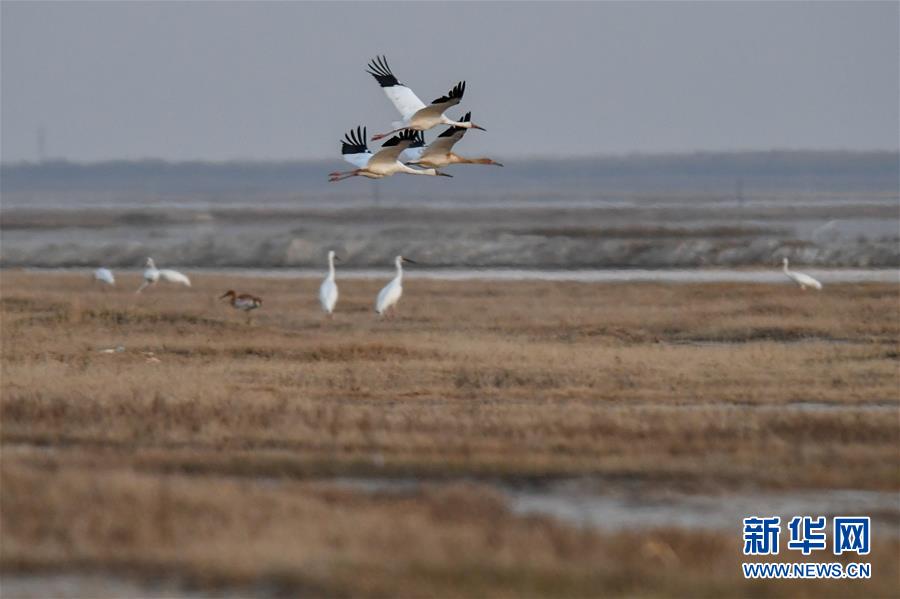 10月19日,在位于吉林省白城市镇赉县的莫莫格国家级自然保护区,几只白鹤从湿地上空飞过。 近日,在吉林省白城市镇赉县,近千只白鹤来到莫莫格国家级自然保护区停歇。白鹤部分种群繁殖于西伯利亚地区,在中国鄱阳湖越冬,莫莫格湿地是它们每年秋季南迁的重要停歇地。 新华社记者 张楠 摄