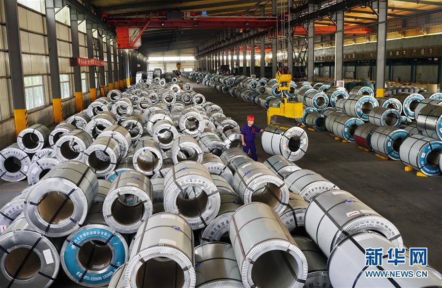 河北省迁安市一家钢铁外贸企业的工人在生产车间内吊装彩涂板(7月13日摄)。新华社记者 牟宇 摄