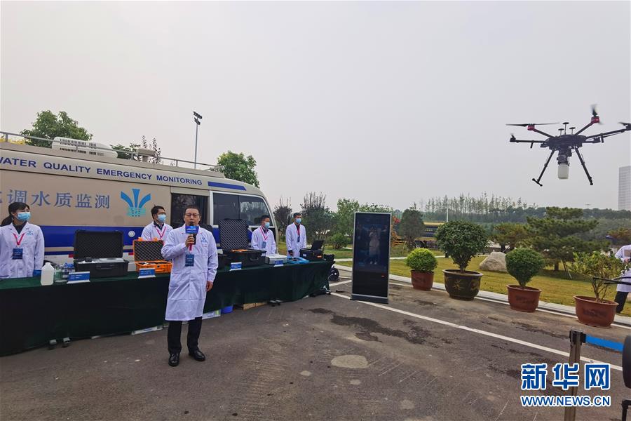 10月16日,在郑州举行的南水北调中线工程2020年度开放日活动现场,工作人员演示无人机采集水样(手机拍摄)。 新华社记者 刘诗平 摄