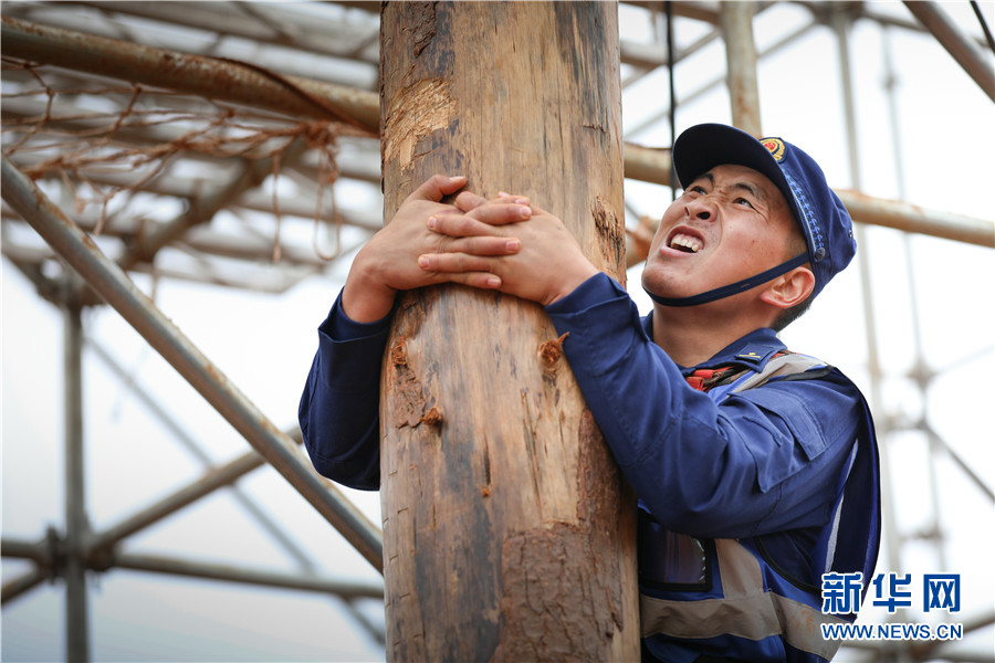 参赛队员攀爬站杆(摄于10月17日)。新华网发(供图)