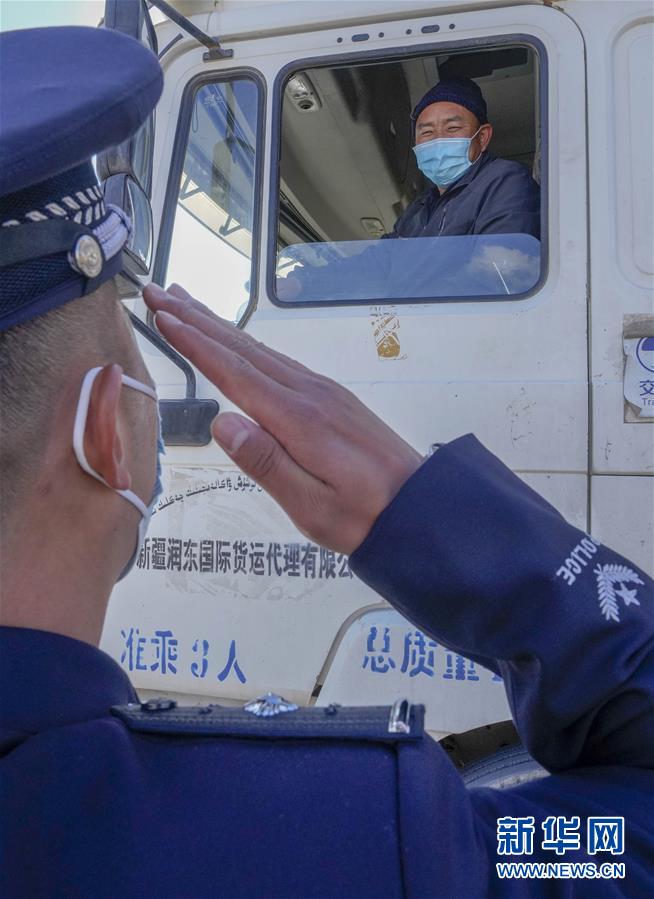 在新疆卡拉苏口岸,卡拉苏出入境边防检查站警官杨开祥向出境车辆驾驶员敬礼(10月16日摄)。 进入十月,位于帕米尔高原的新疆卡拉苏口岸繁忙如常。口岸采取严格闭环式管理的通关模式,保证“一带一路”沿线对外贸易的畅通。卡拉苏口岸海拔4000多米,作为中国对塔吉克斯坦开放的陆路口岸,在中塔双边贸易中扮演着越来越重要的角色。 新华社记者 赵戈 摄