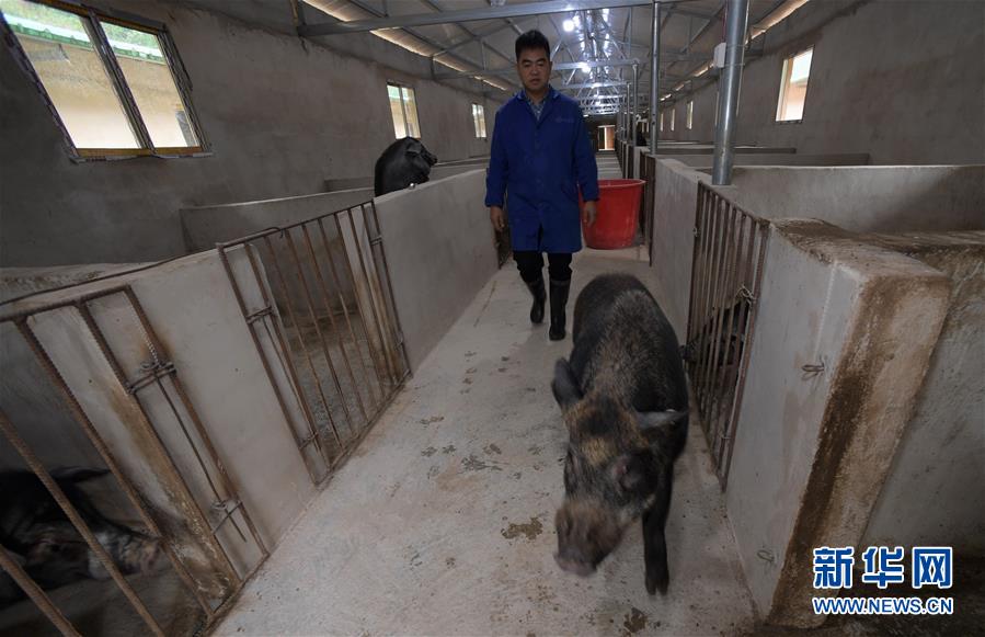 10月20日,在贵州省铜仁市玉屏侗族自治县皂角坪街道瓮阳村香猪养殖场,村民夏政华赶香猪进圈舍。 贵州省铜仁市玉屏侗族自治县皂角坪街道瓮阳村曾是玉屏县的二类贫困村,全村有建档立卡户92户353人。2018年初,为改变贫困面貌,瓮阳村党支部积极筹措资金、申请项目,带领全村群众修公路、建文化广场和产业路,鼓励群众参与人居环境改造,发动群众流转土地,发展水果种植、莲田养鱼、香猪养殖等产业。如今,瓮阳村各类产业蓬勃发展,村民通过土地流转、入股分红、产业务工等方式实现收入大幅增长。2019年,瓮阳村人均可支配收入达1.6万元,较2017年增加7000元。2019年瓮阳村实现全村贫困户清零。 新华社记者杨楹摄
