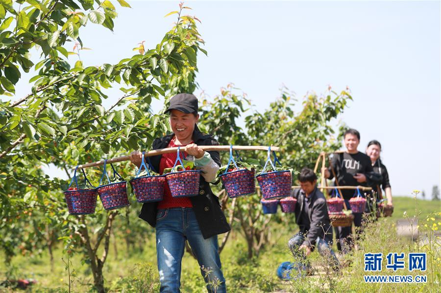 村民在贵州省铜仁市玉屏侗族自治县皂角坪街道瓮阳村樱桃产业园采收樱桃(4月27日摄)。 新华社发(胡攀学 摄)
