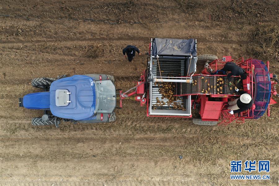 10月20日,工作人员在宁夏固原市原州区中河乡丰堡村向农民展示新型马铃薯收获机作业情况(无人机照片)。新华社记者 王鹏 摄