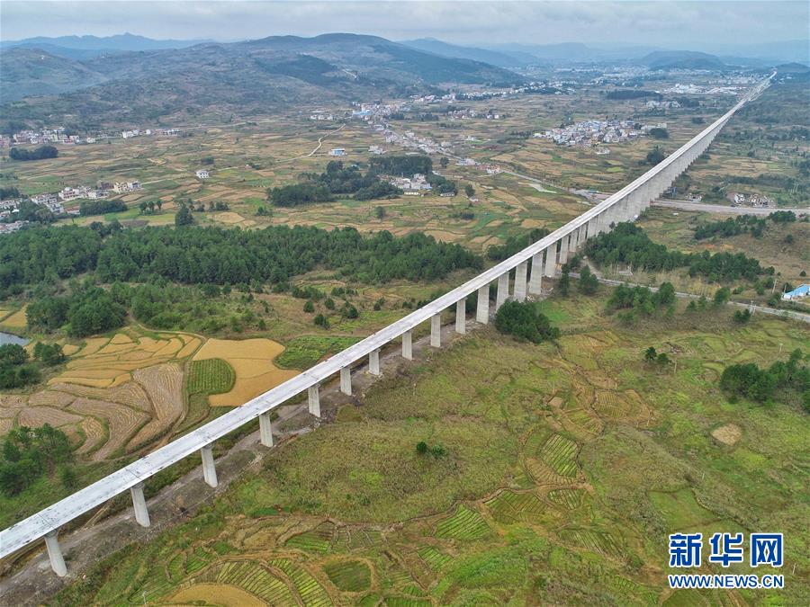 这是由中铁四局建设的位于贵州省独山县的贵南高铁拉里特大桥(10月20日摄,无人机照片)。 贵(贵阳)南(南宁)高铁是我国“八纵八横”高速铁路主通道包头至海口通道的重要组成部分,也是西南地区首条设计时速350公里的高速铁路。目前,中铁四局等建设单位抢抓工期全力施工。 新华社记者 刘续 摄
