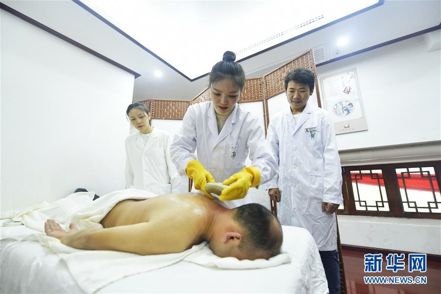 10月20日,廖先梅(中)在诊所为学徒示范中药热熨敷技术。新华社发(罗星汉 摄)
