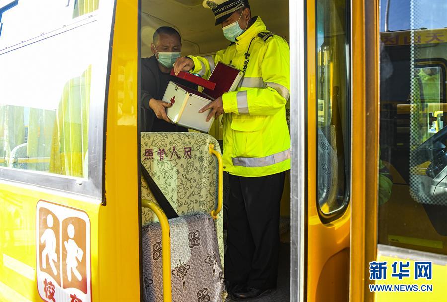 10月21日,乌鲁木齐市天山区交警大队民警宁江海在检查辖区幼儿园校车的医药箱。 为保障学生乘车安全,新疆乌鲁木齐市公安局交警支队从10月21日起对当地各中小学、幼儿园的校车开展冬季安全检查,并对校车驾驶员及校方负责人员进行冬季行车安全培训。 新华社记者 王菲 摄