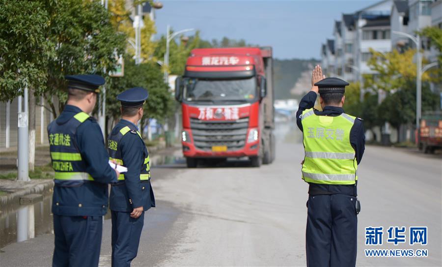 10月21日,路政执法人员和交警在贵州省铜仁市玉屏侗族自治县农村公路上严查公路货运车辆超限超载。