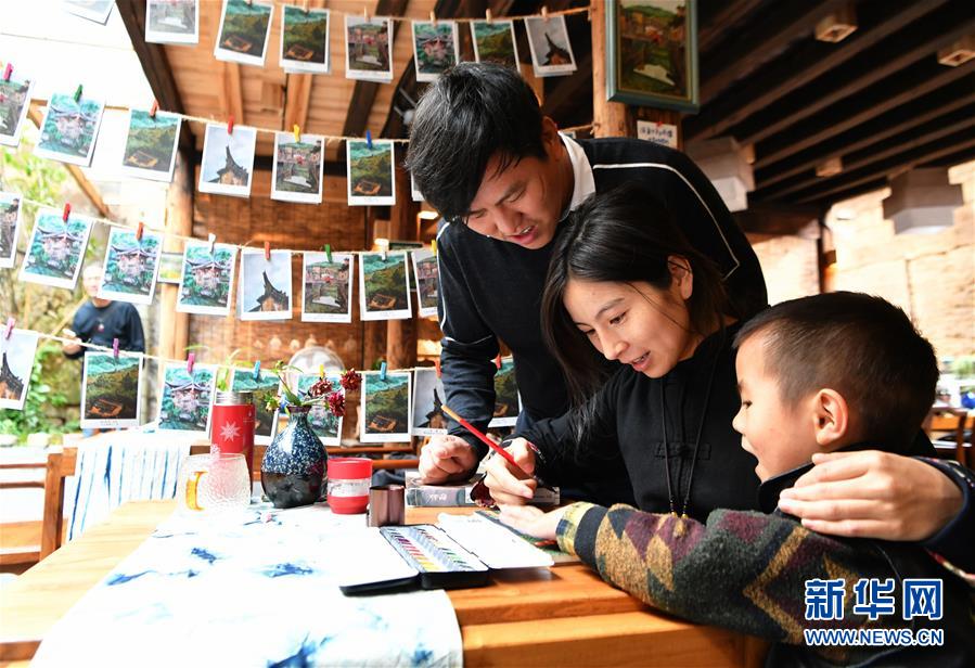 来自江西省吉安市的胡文亮是龙潭村引进的文创和专业设计人才。2020年5月,他投资六十多万元翻新改造的兼具酒馆、民宿和陶艺等功能的文创空间正式开业。“十一”黄金周期间接待游客近800人次。这是胡文亮(左一)和爱人曾婉珍(中)、小孩一起在绘制龙潭村主题明信片(10月21日摄)。 新华社记者魏培全摄