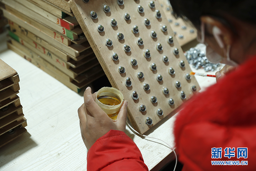 这是微型耳机喇叭生产过程中的分线工序。新华网记者 焦鹏 摄
