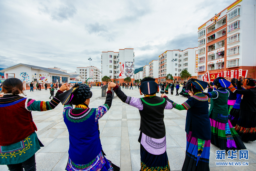 彝族人能歌善舞,图为感恩社区群众在广场上跳舞。新华网 郭小天 摄
