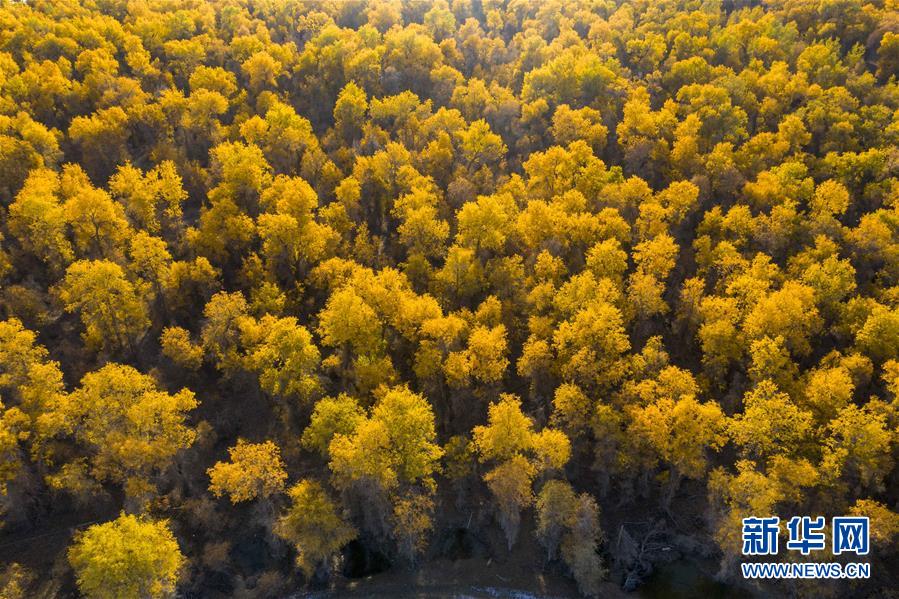 新疆塔里木河流域阿克苏地区沙雅县的一处胡杨林景观(10月22日摄,无人机照片)。新华社记者 胡虎虎 摄