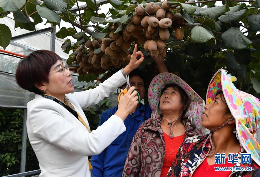 在周宁县农民创业示范基地特色水果种植园,宁德市农业科学研究所的科技特派员池春梅(左一)在指导当地农民采摘红心猕猴桃(10月22日摄)。 近年来,福建省宁德市周宁县在推进产业扶贫和乡村振兴过程中,依托当地农业资源和地理气候优势,打造特色扶贫种植、养殖基地,引导农民发展有机蔬菜、花卉苗木、有机水果等特色产业种植,通过土地流转、资金入股、劳务增收等多种形式,帮助贫困户脱贫,带动当地农民致富。 新华社记者魏培全摄