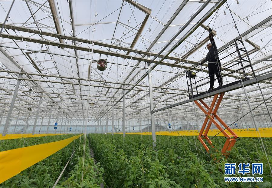 在耿店村的现代化玻璃温室内,一位村民使用升降设备进行田间养护(10月20日摄)。