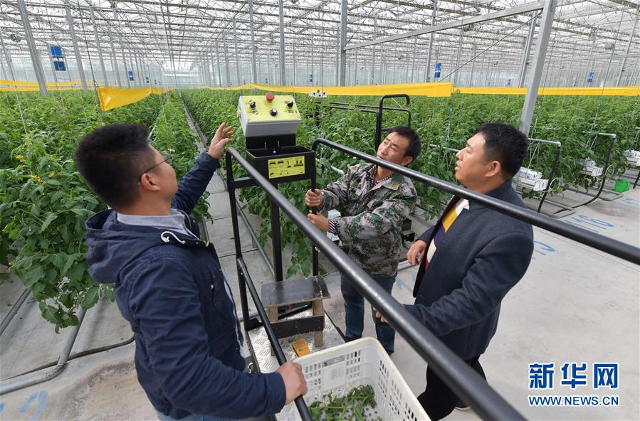 几位村民在耿店村的现代化玻璃温室内试用现代化采摘设备(10月20日摄)。 新华社记者 李贺 摄