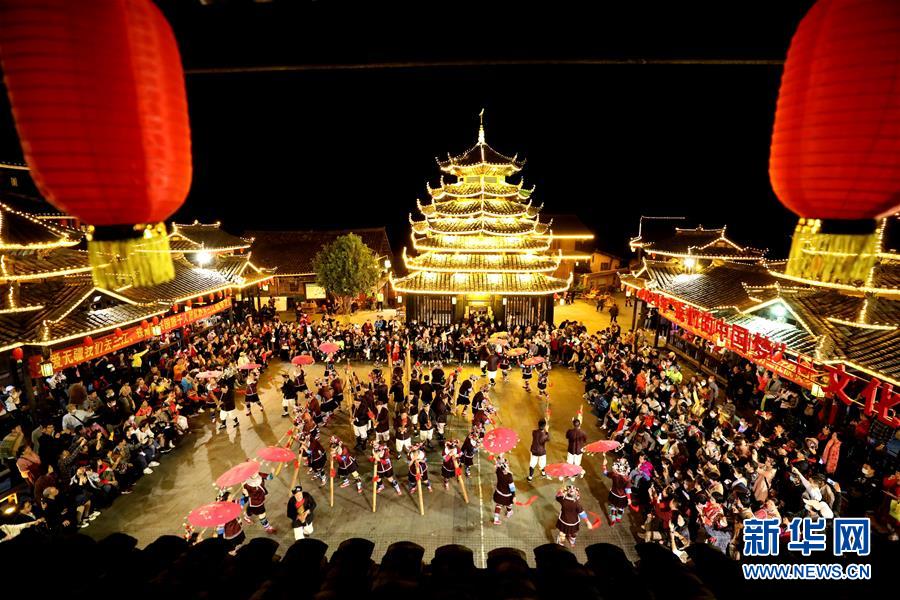 10月22日,在广西柳州市三江侗族自治县林溪镇冠小屯,侗族村民在表演芦笙踩堂。 当日,来自广东的一个千人旅游团走进广西柳州市三江侗族自治县,通过观楼桥、赏歌舞、品侗族百家宴等丰富形式,体验侗乡缤纷多彩的民俗风情。 近年来,三江县充分发挥民族特色文旅游资源,依托便捷交通条件,加大旅游引客力度,让特色民族风情游带动餐饮、住宿、农产品加工等相关产业快速发展,助力群众脱贫致富。 新华社发(梁克川 摄)