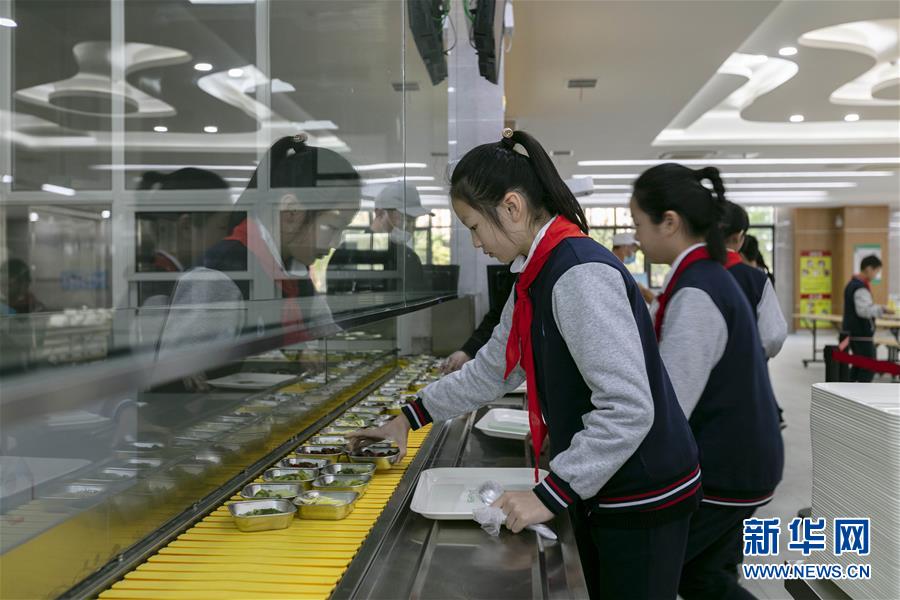 10月23日,学生从传送带上取用午餐。 近日,上海市闵行中学附属实验中学在食堂引入人工智能设备用于制作食物。人工智能食堂的机器人可制作上千种菜品,能在一个半小时内供餐上千份。 新华社记者 王翔 摄