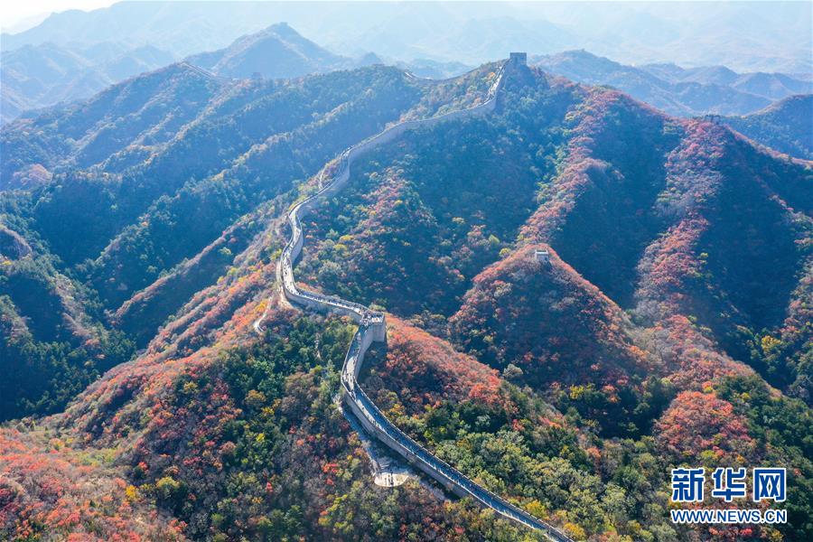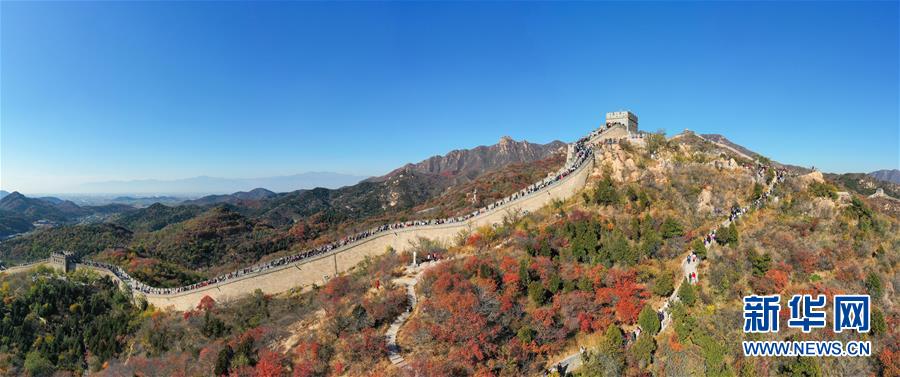 10月24日,游人在八达岭长城游览(无人机全景照片)。 深秋时节,北京八达岭长城红叶进入最佳观赏期,红叶映长城美如画卷。 新华社记者 陈晔华 摄