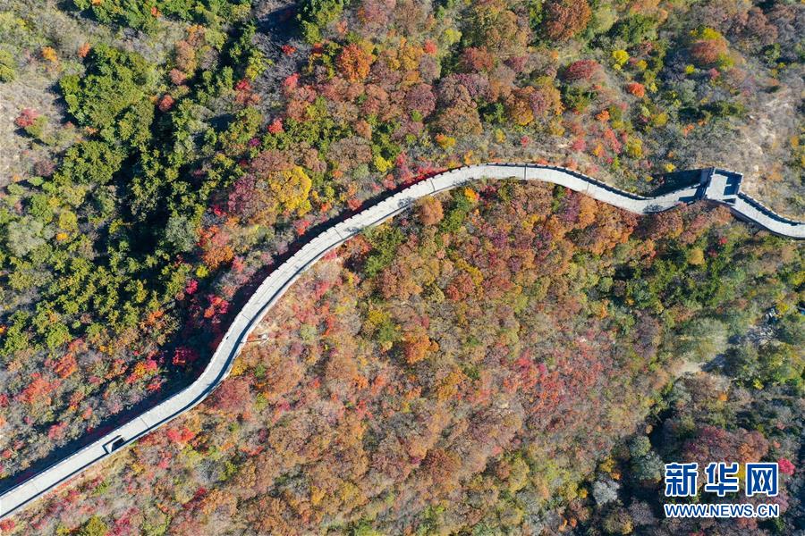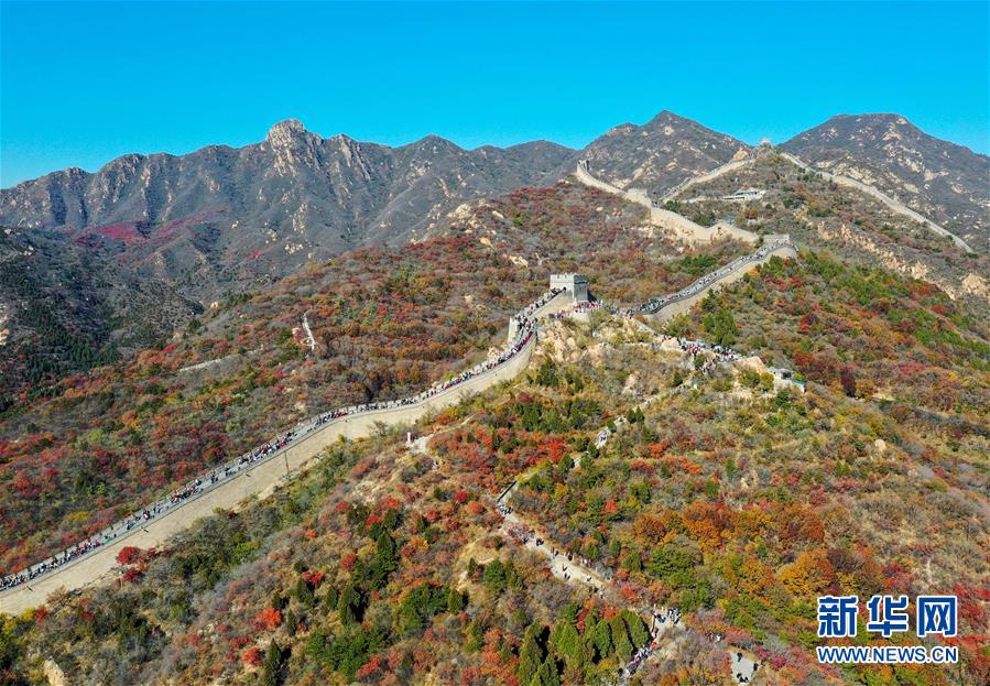 10月24日,游人在八达岭长城游览(无人机照片)。 深秋时节,北京八达岭长城红叶进入最佳观赏期,红叶映长城美如画卷。 新华社记者 陈晔华 摄