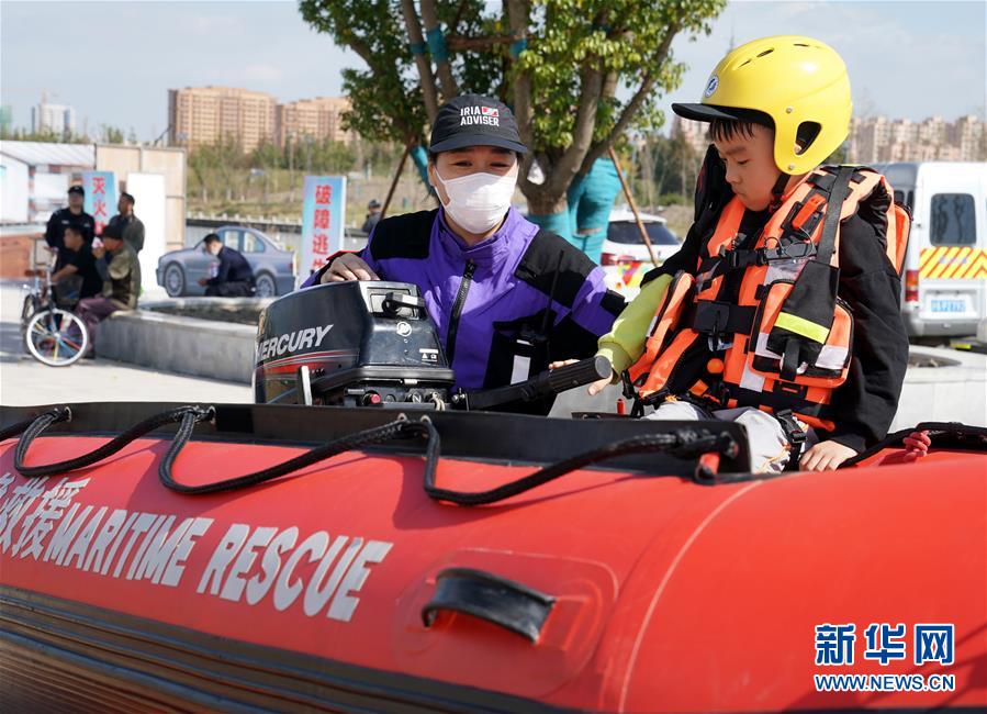 10月25日,小朋友在体验水上救授人员的穿戴装备和救援艇。 当日,2020年上海青少年应急安全体验营活动在上海奉贤区举行。该体验营由共青团上海市委员会、上海市应急管理局等联合多家青年社会组织共同举办,免费提供应急逃生、消防安全、防骗防拐、交通安全、急救体验等近40项有关应急安全、自护自救的实践项目和体验服务,以深化青少年安全自护意识,提高自救互救能力水平。 新华社记者 刘颖 摄