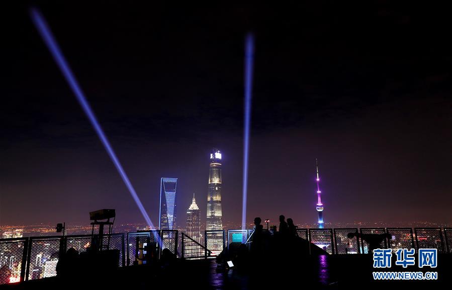 10月26日,几名工作人员在白玉兰广场顶楼调试灯光秀设备。 第三届中国国际进口博览会将于11月5日至10日在上海举办。近日,上海迎接盛会的各项筹备工作在紧锣密鼓地进行中,浦江两岸将在进博会开幕当天上演精彩灯光秀。 新华社记者 方喆 摄