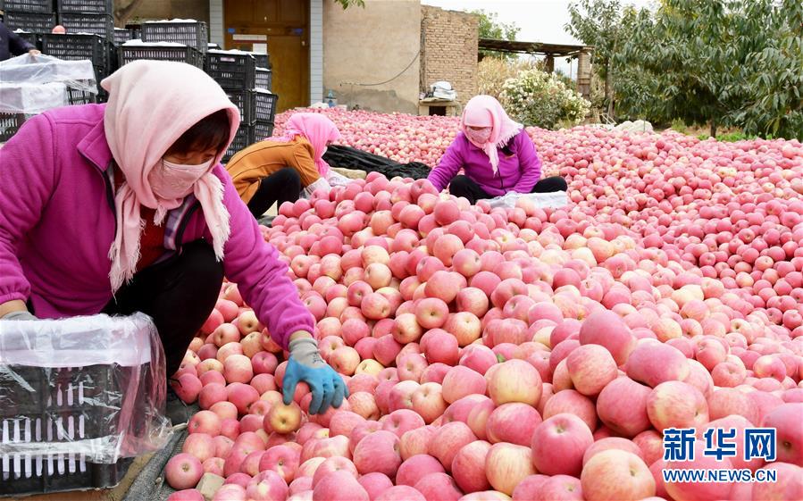 10月26日,甘肃省临夏回族自治州永靖县岘塬镇姬川村的果农在分拣苹果。 近年来,甘肃省永靖县不断调整优化农业产业结构,利用“企业+合作社+农户”的发展模式,打造以苹果为代表的特色林果产业。目前,该县果园面积2万多亩,年产果品约3500万公斤,有效带动贫困群众增收。 新华社发(史有东 摄)