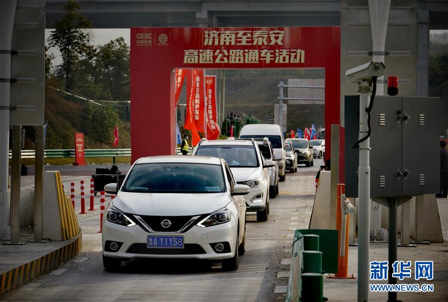 10月27日,车辆驶入济泰高速。 当日,由中国能建葛洲坝路桥公司承建的济南至泰安(简称济泰)高速公路通车。济泰高速是山东省高速公路规划网的“纵六”并行线,建成后,从济南至泰安只需半小时左右。该公路将为泰山旅游增加一条连接通道,缓解京台高速公路的压力,带动沿线经济发展。 新华社记者 邢广利 摄