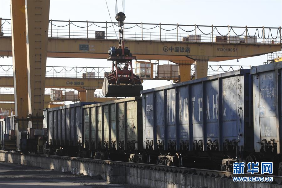 10月28日,在绥芬河铁路口岸换装现场,工人操控龙门吊对进口煤炭进行换装作业。 作为我国对俄贸易的重要口岸,黑龙江绥芬河口岸铁路货运量持续增加。截至10月27日,绥芬河铁路口岸今年进出口运量完成800.9万吨,其中矿粉进口比去年同期增长64%。 新华社发(张涛 摄)