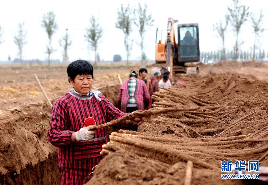 10月28日,临漳县西营村村民在地里收获“铁棍”山药。