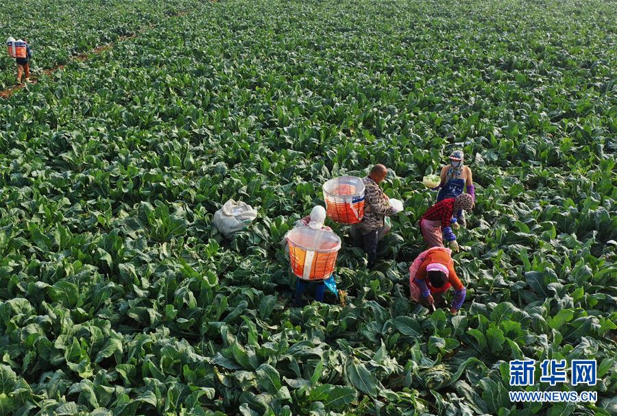 10月28日,乐亭县马头营镇黄坨村村民在田间收获菜花(无人机照片)。 近年来,河北省唐山市乐亭县通过建设规模化生产基地、推行标准化管理技术、建立龙头企业开展集约化营销,积极引导农民发展菜花种植,取得良好效益。目前,该县菜花种植面积近3万亩,年产优质菜花10.5万吨。 新华社记者 杨世尧 摄