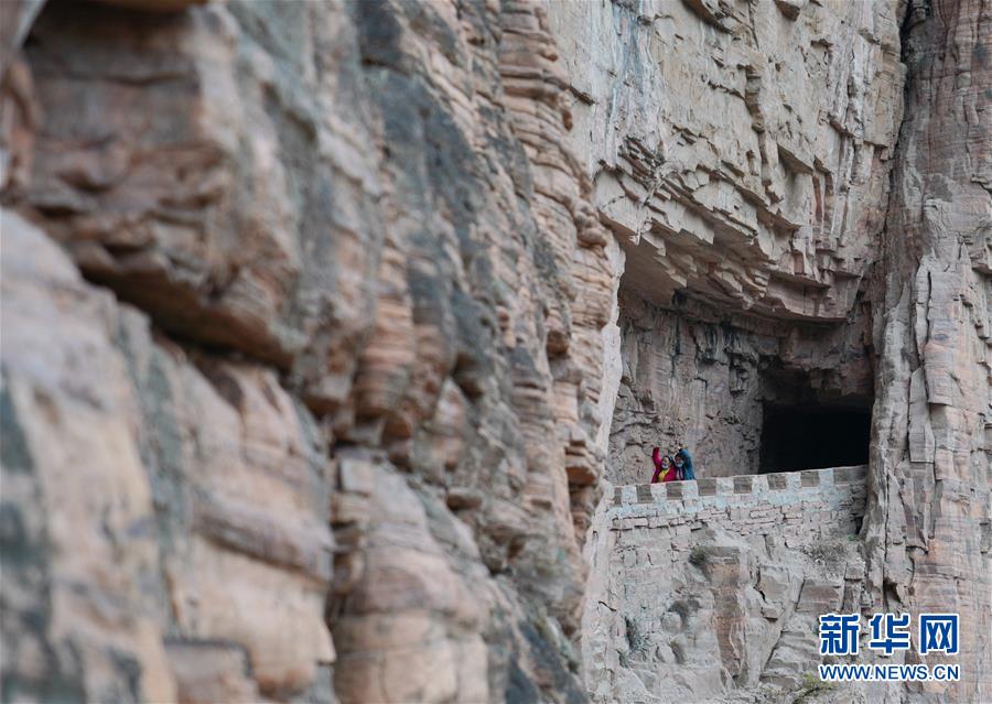 10月28日,游客在峡沟村“挂壁公路”游览。 河北省沙河市柴关乡峡沟村“挂壁公路”修筑于太行山深处峡沟水库北侧崖壁上,是当地群众20世纪70年代为解决“行路难”、完全依靠人工开凿而成。“挂壁公路”全长560米,高于水面数十米,路洞顺山势蜿蜒,内高3米,宽约6米,公路每隔几米就留有透光“天窗”,用于采光、通风、观景。如今,峡沟水库和“挂壁公路”已成为当地发展全域旅游的重要载体。 新华社记者 牟宇 摄