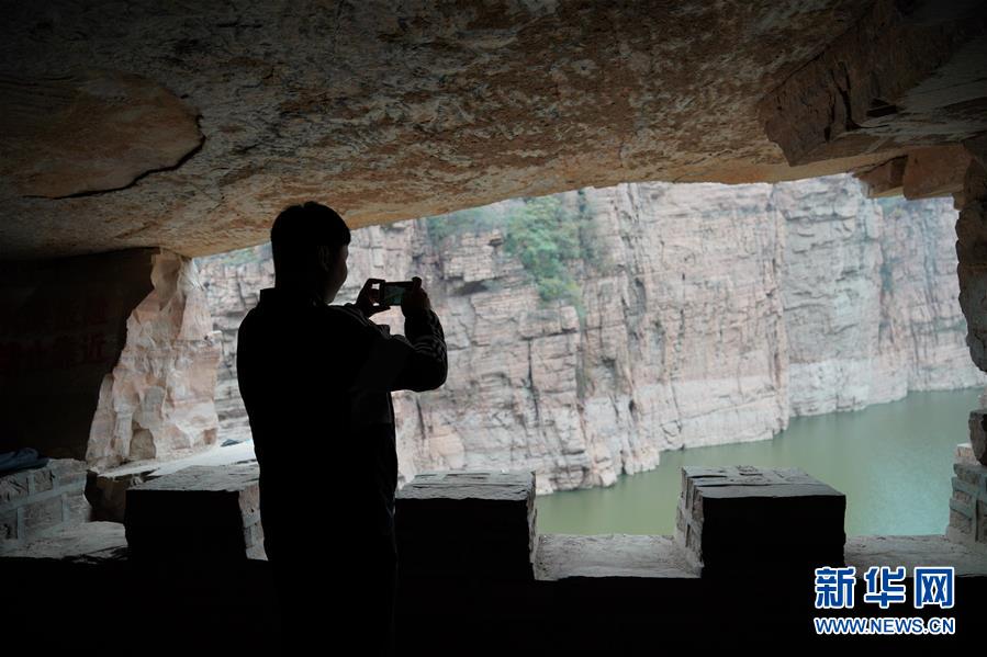10月28日,游客在峡沟村“挂壁公路”拍照。 河北省沙河市柴关乡峡沟村“挂壁公路”修筑于太行山深处峡沟水库北侧崖壁上,是当地群众20世纪70年代为解决“行路难”、完全依靠人工开凿而成。“挂壁公路”全长560米,高于水面数十米,路洞顺山势蜿蜒,内高3米,宽约6米,公路每隔几米就留有透光“天窗”,用于采光、通风、观景。如今,峡沟水库和“挂壁公路”已成为当地发展全域旅游的重要载体。 新华社记者 牟宇 摄