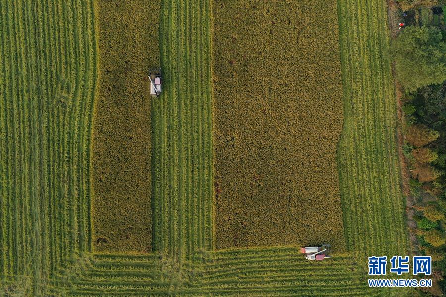 10月30日,吴兴区八里店镇尹家圩粮油植保农机专业合作社的农户使用联合收割机在稻田里进行收割作业(无人机拍摄)。 近日,浙江湖州吴兴区八里店镇尹家圩粮油植保农机专业合作社的3000余亩水稻迎来收割季。 新华社记者 黄宗治 摄