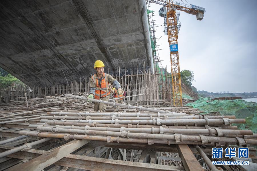 10月31日,在中建五局承建的重庆嘉陵江磁井段防洪护岸综合整治工程三标段项目施工现场,工人在搬运拆卸的钢管。新华社记者 黄伟 摄