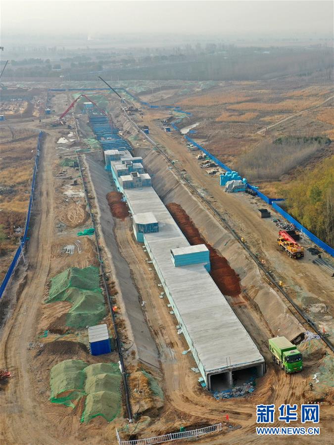 这是10月31日拍摄的河北省张家口市宣化区滨河新城地下综合管廊工程施工现场(无人机照片)。 自2019年8月开工以来,总投资120亿元的河北省张家口市宣化区滨河新城项目建设加紧施工中。该项目是宣化区“保护古城、疏解老城、建设新城”的政府和社会资本合作的大型城建类项目。作为其配套工程,滨河新城地下综合管廊工程施工稳步推进。管廊工程按双舱管廊设计,内设给水管线、热力管线、电力管线和通信管线等,总长约2300米。 新华社发(武殿森 摄)