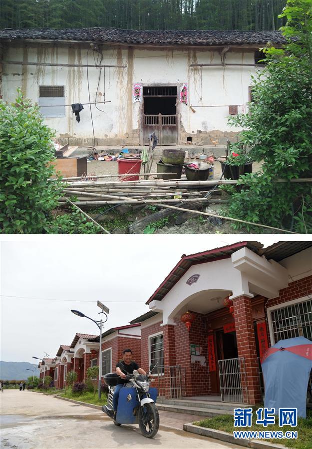 拼版照片的上图:江西省修水县黄沙镇汤桥村村民旧屋(2015年摄,资料照片)。 下图:在江西省修水县黄沙镇汤桥村易地扶贫搬迁安置点,搬迁至此的村民林英华驾驶摩托车从村里的药材产业合作社下班回家(5月20日摄,新华社记者 彭昭之 摄)。 新华社发