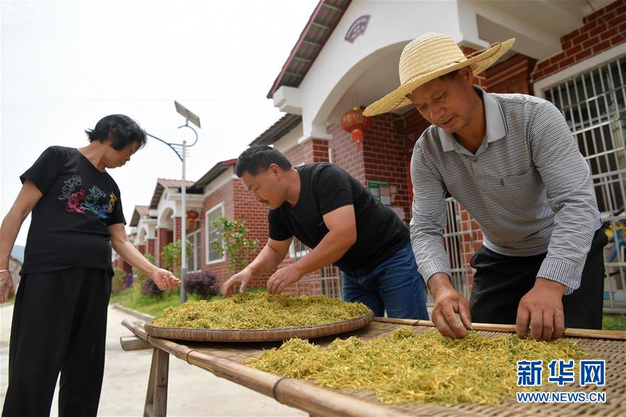 在江西省修水县黄沙镇汤桥村,村民林英华(中)和邻居在屋前晾晒金银花(5月20日摄)。 新华社记者 彭昭之 摄