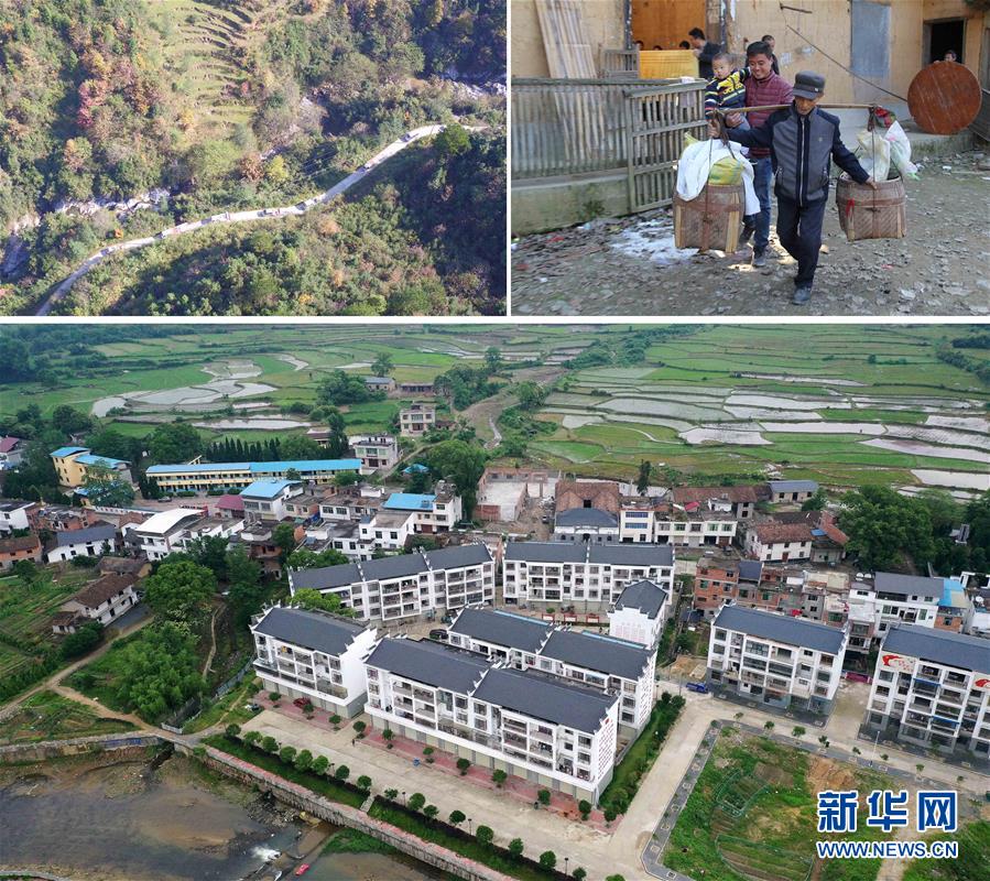 拼版照片的上左图:在江西省修水县上奉镇麻洞村,村民胡尚海一家和邻居们在乘车搬离大山沟(2017年11月摄,资料照片)。 上右图:在江西省修水县上奉镇麻洞村,村民胡尚海抱着孩子,他的父亲挑着扁担和邻居们一起搬家,前往镇上的易地扶贫搬迁安置点(2017年11月摄,资料照片)。 下图:这是胡尚海一家目前居住的位于江西省修水县上奉镇的易地扶贫搬迁安置点(5月21日摄,新华社记者 彭昭之 摄)。 新华社发
