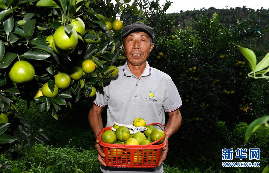 11月1日,在南斗山琼中绿橙示范种植基地,工作人员展示采摘好的琼中绿橙。 近日,海南琼中黎族苗族自治县琼中绿橙迎来上市季。2020年,琼中绿橙种植面积达2.9万亩,挂果面积1万亩,预计产量将达到1000万斤。 新华社记者 杨冠宇 摄