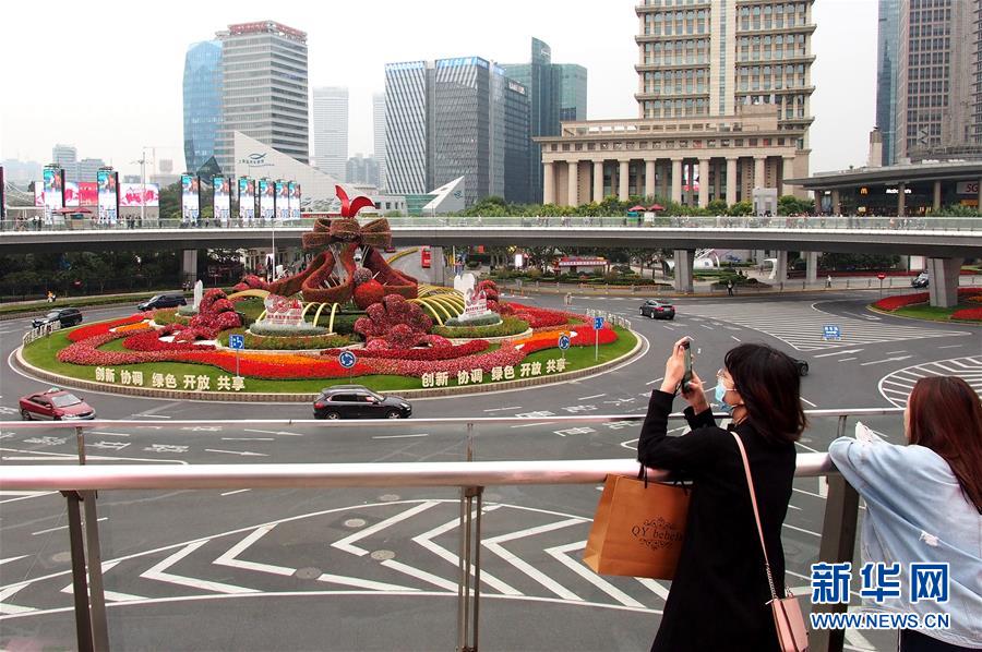 11月1日,一些游客在上海浦东陆家嘴环岛的天桥上拍摄立体花坛。新华社记者 陈飞 摄