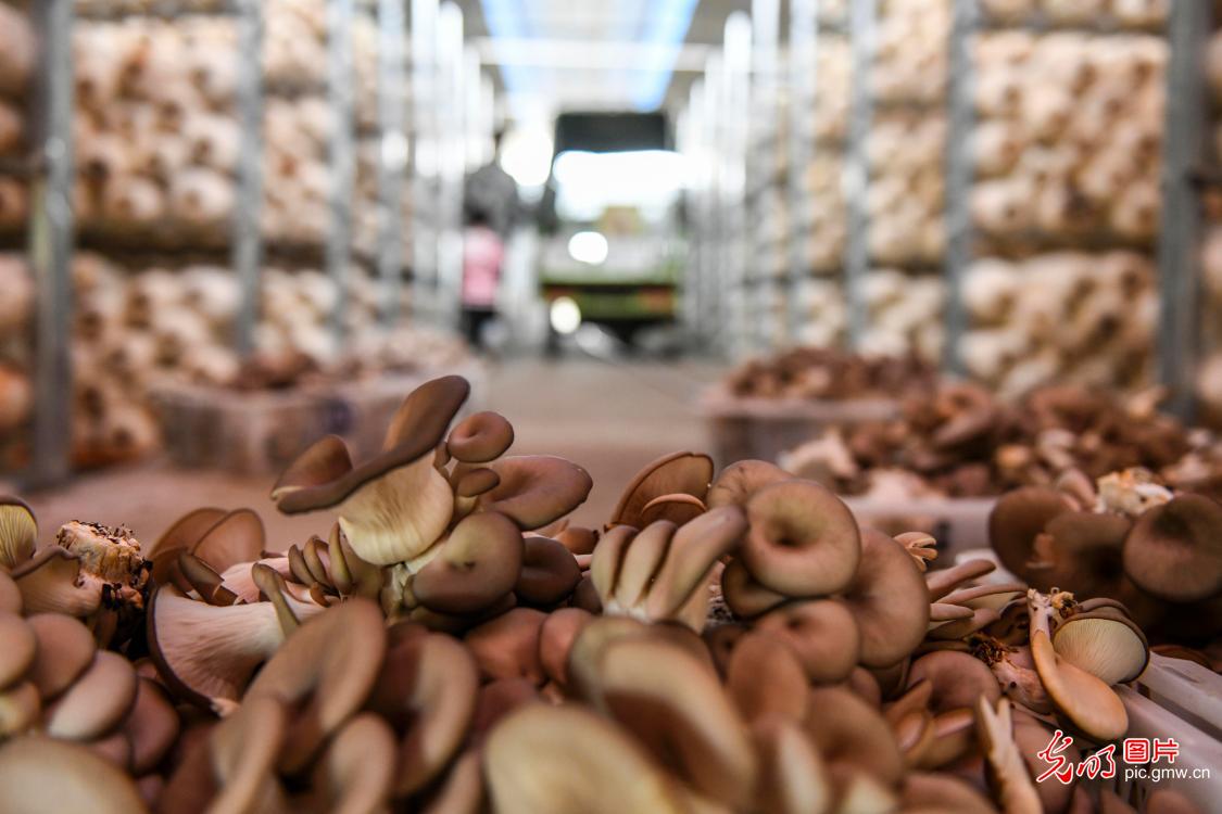 2020年11月1日,湖南省道县白芒铺镇马垒村平菇食用菌种植示范基地,农户在搬运平菇。近年来,该县通过"合作社+基地+贫困户"的模式,发展种植优质大棚平菇产业,贫困户通过入股和务工实现增收,走出了一条脱贫致富路。(蒋克青摄/光明图片)