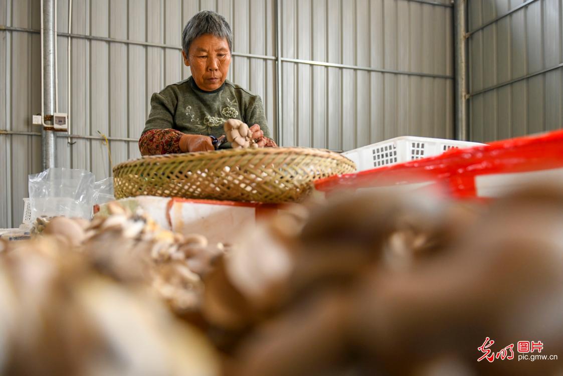 2020年11月1日,湖南省道县白芒铺镇马垒村平菇食用菌种植示范基地,农户在分拣刚采摘的平菇。近年来,该县通过"合作社+基地+贫困户"的模式,发展种植优质大棚平菇产业,贫困户通过入股和务工实现增收,走出了一条脱贫致富路。(蒋克青摄/光明图片)