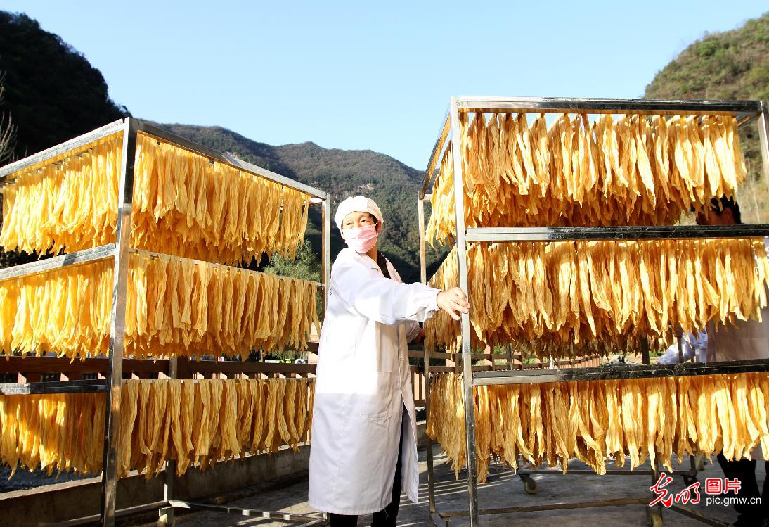 2020年11月2日,湖北十堰市房县红塔镇兴胜村农民在扶贫车间晾晒豆油精。荣获国家地理标志产品的"房县豆油精",俏销日本、越南、韩国等6个国家,畅销国内25个省、直辖市,年均收入15亿元,成为农民增收致富的主力产业。(张启龙摄/光明图片)