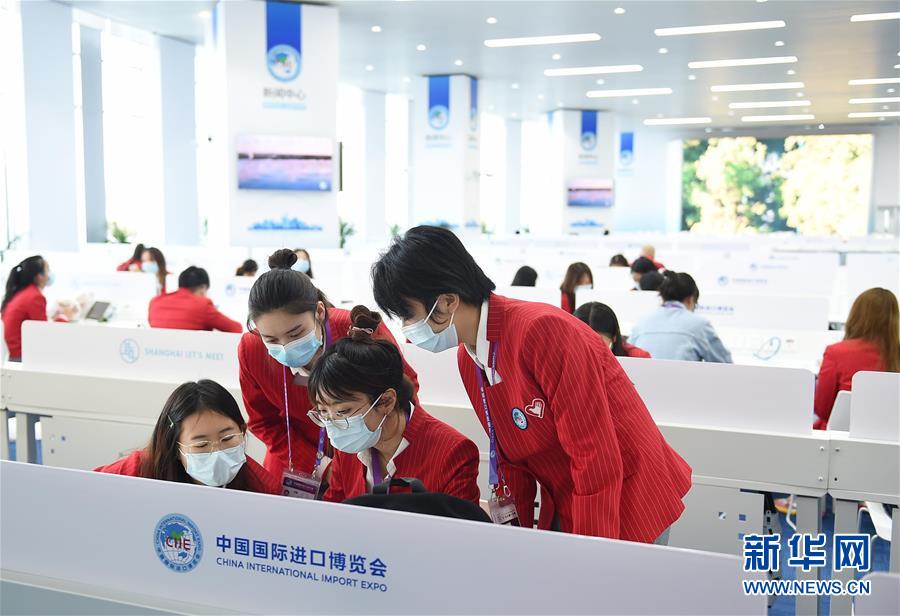 11月3日,志愿者在新闻中心工作。 第三届中国国际进口博览会新闻中心已正式开始运营。 新华社记者 赵丁喆 摄