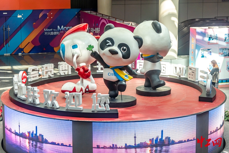 2020年11月3日,上海,第三届中国国际进口博览会将于11月5日开幕,在地铁人民广场“大三角”换乘厅的中心位置,两座进博会吉祥物“进宝”雕塑已布置就位,带着蓝黄色围巾举着四叶草的“进宝”大熊猫形象显得十分有亲和力。