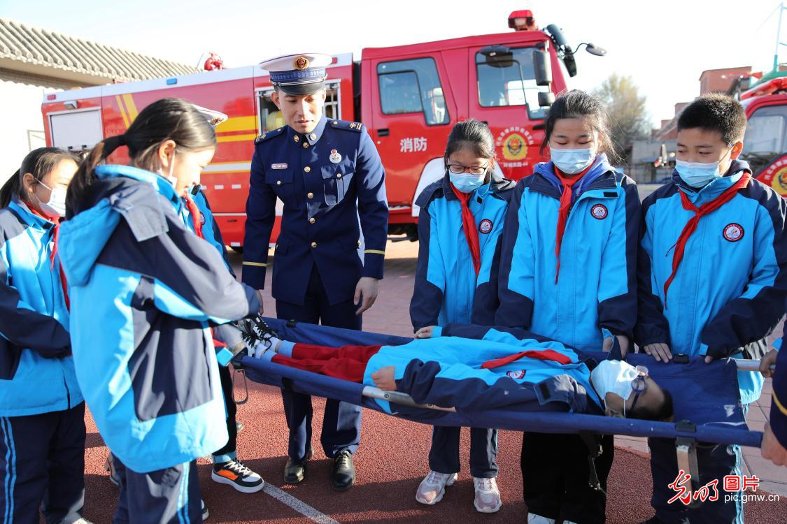 2020年11月3日,河北省承德市双桥区消防救援大队与普宁小学联合开展消防进校园安全互动体验教育活动。小朋友通过体验救生设备、安全使用消防器材等,在互动活动中学习消防知识,提升自救能力,迎接"119消防宣传日"的到来。(刘环宇摄/光明图片)